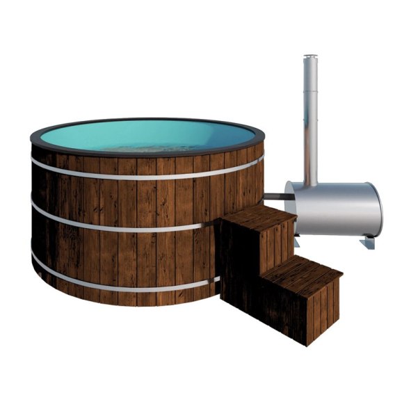Balia ogrodowa z drewna modrzewiowego w kolorze ciemny brąz. Średnica 200 cm, wkład plastikowy, piec zewnętrzny, schody, ławka i pokrywa. Gotowa do użycia, dla 6 osób.